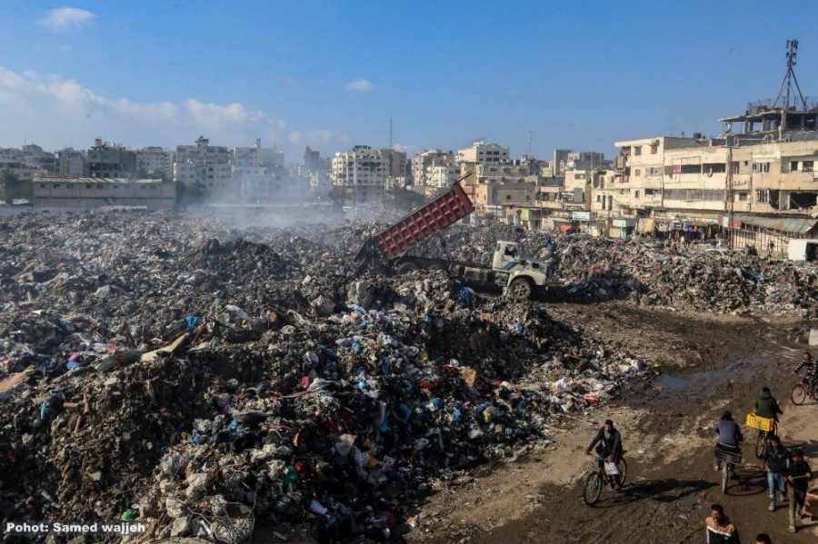 ويُقدّر إجمالي كميات النفايات المتراكمة في قطاع غزة خلال حرب الإبادة الجماعية بحوالي (710,000) طن من النفايات المتنوعة، كنفايات المنازل، والمخلفات البشرية، ونفايات الصرف الصحي والنفايات الطبية الخطرة، تنتشر في (190) مكب عشوائي مؤقت غير مؤهل، معظمها بين السكان وفي الأحياء السكنية وعلى مقربة من مراكز الإيواء ومخيمات النازحين. وهو ما يعتبر سبباً رئيساً لانتشار الأمراض والأوبئة والحشرات والقوارض، وهي مشكلة بيئية تهدد سكان القطاع وتهدد المستقبل البيئي. تجدر الإشارة إلى أن قوات الاحتلال الإسرائيلي دمرت ما مجموعه (141) آلية، و(3,876) حاوية، من منظومة النفايات الصلبة في قطاع غزة[4].
